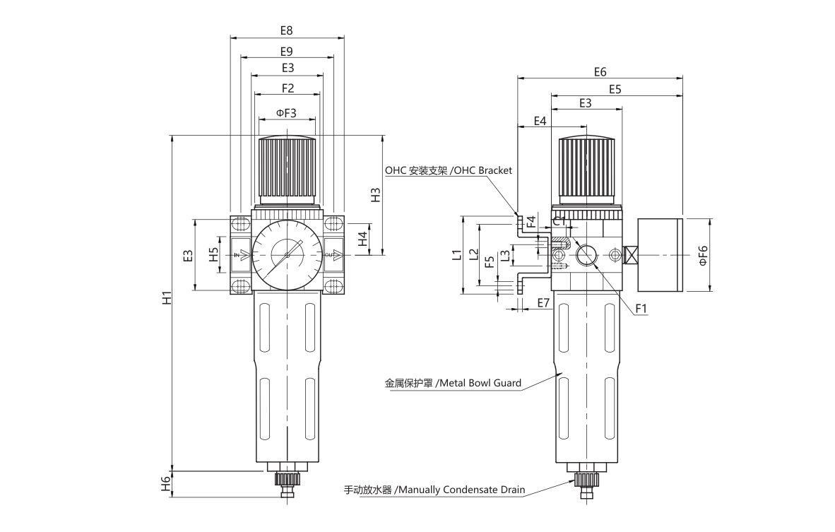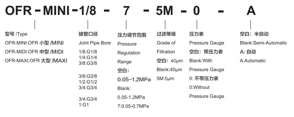 For special application,the standard 40μm filter element may easily be replaced by a 5μm filter element.The OR maintain imputting constant operating pressure despite fluctuation in line pressure and the amount of air consumed.