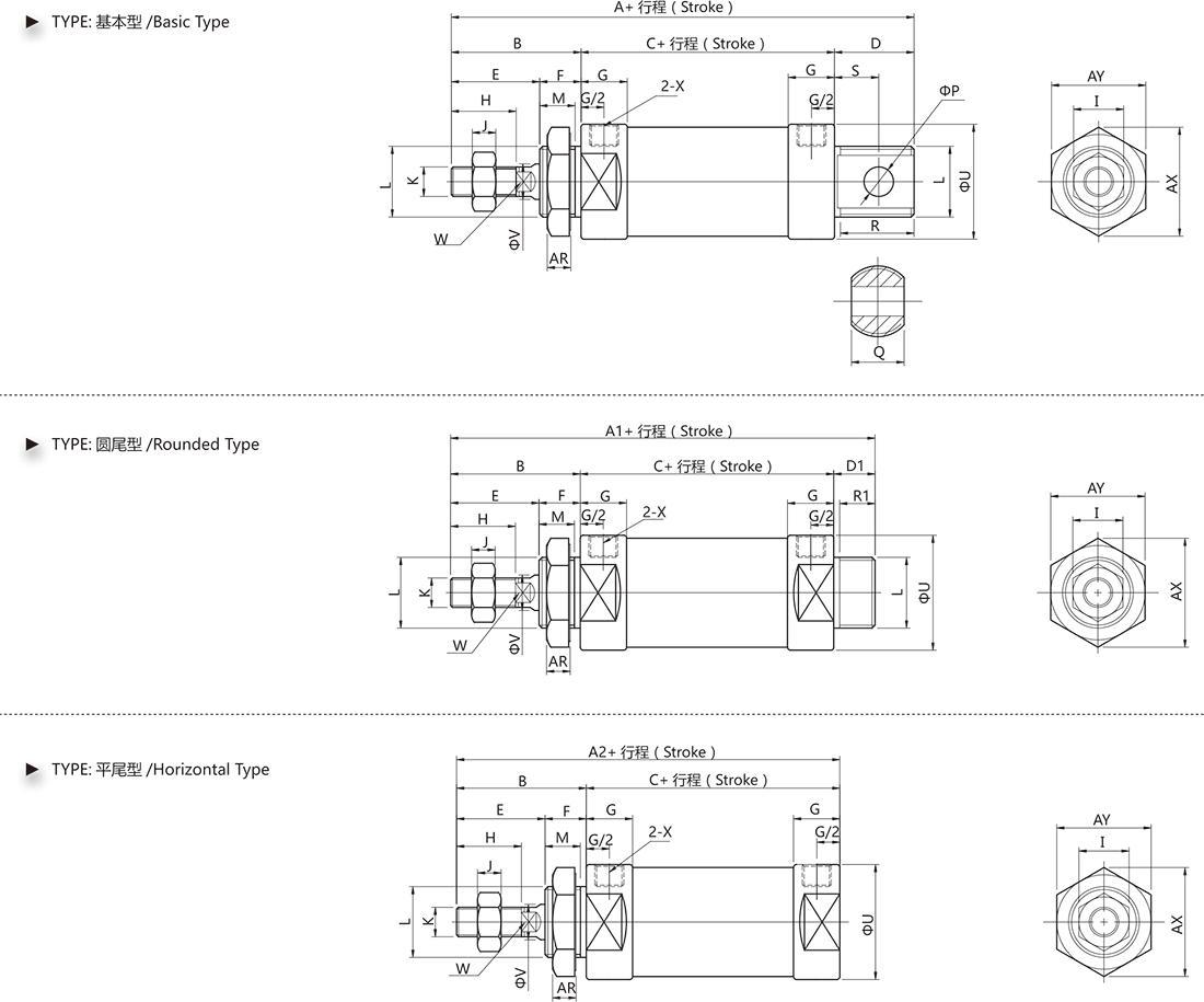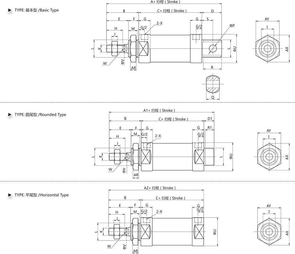 | Symbol/Bore(mm) | L | M | P | Q | R | R1 | S | U | V | W | X | AR | AX | AY |