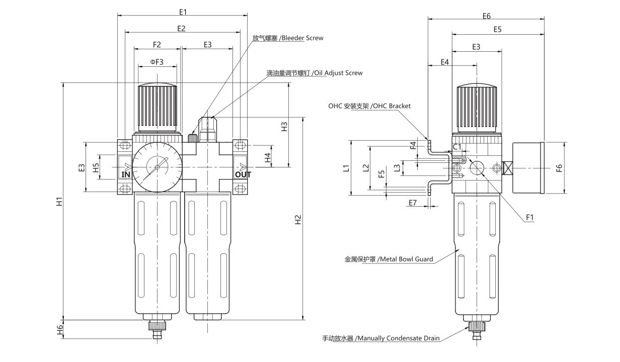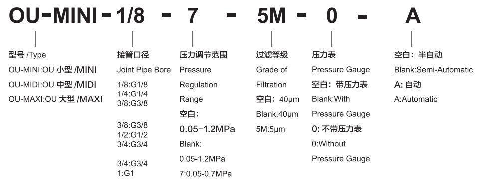 The proportional lubricator adds a regulated quantity of oil to the filtered air. The oil-mist content proportional to the flow and oil can The OU consisted of OFR and OL, each unit can be ordered separately.The OF with water separator cleans the compressed be added during operation.The oil drip rate is controlled by the adjustable bolt.Normally,1 to 12 drops/1000L of the air is sufficient.