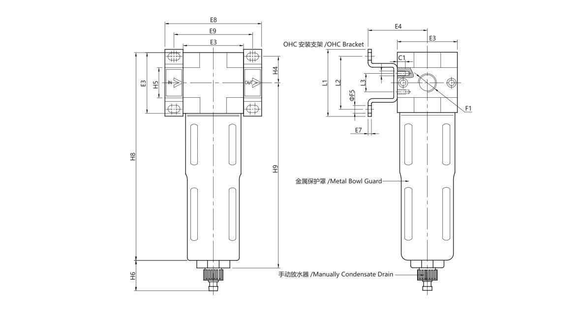 Filter and pressure regulator combine a single unit,and cleans the compressed air of fluid oil,condensation and dirt particles. For special application,the standard 40μm filter element may easily be replaced by a 5μm filter element.